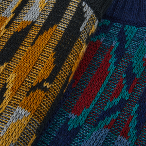 Jacquard knit sweater with an all over navy, blue, red and green pattern.